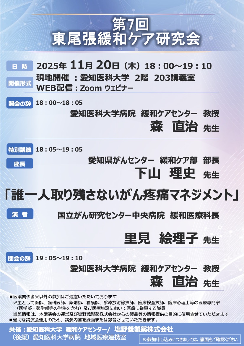2025年3月11日2025年11月10日 by kanwa 緩和ケアセンター勉強会&連携カンファレンス開催のご案内 2025年11月20日(木) 18:00~ 11月の緩和ケアセンター勉強会&連携カンファレンスは例年どおり東尾張緩和ケア研究会を開催させて頂きます。 よろしくお願いいたします。